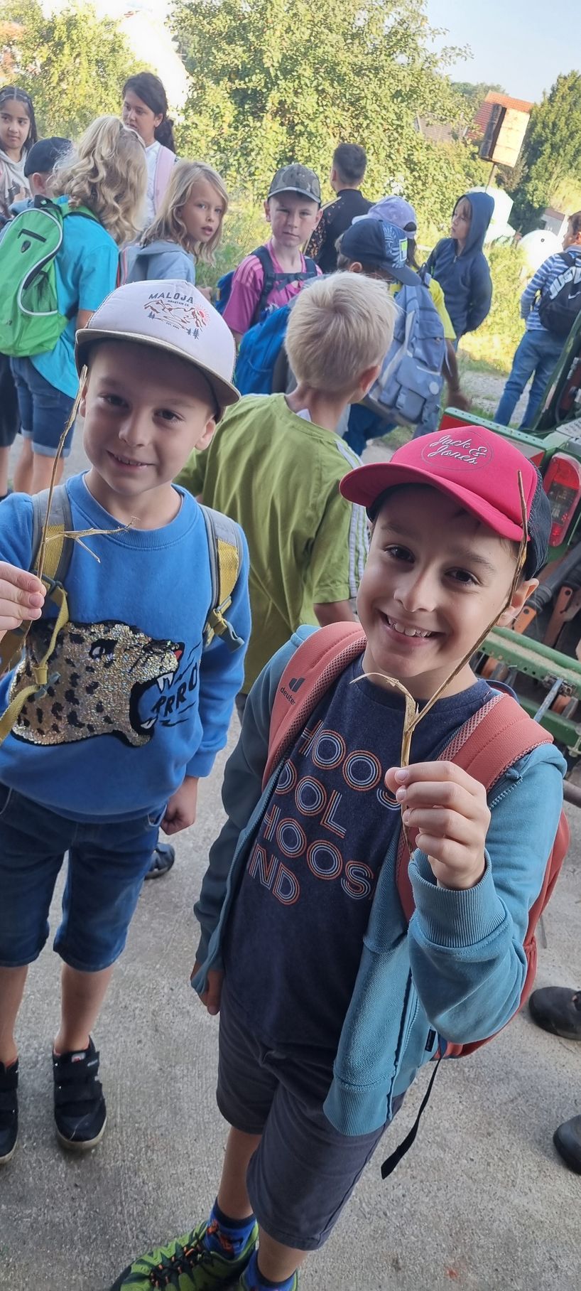 Bei Bauer Carl- Christian und seiner Frau Tanja konnten wir einen Blick ins Getreidesilo werfen, Getreide unterscheiden und sortieren, den Trecker und den Mähdrescher inspizieren und sogar alte Erntegeräte wie den Dreschflegel ausprobieren. Wer ganz mutig war, durfte dann noch auf den Heuboden klettern.