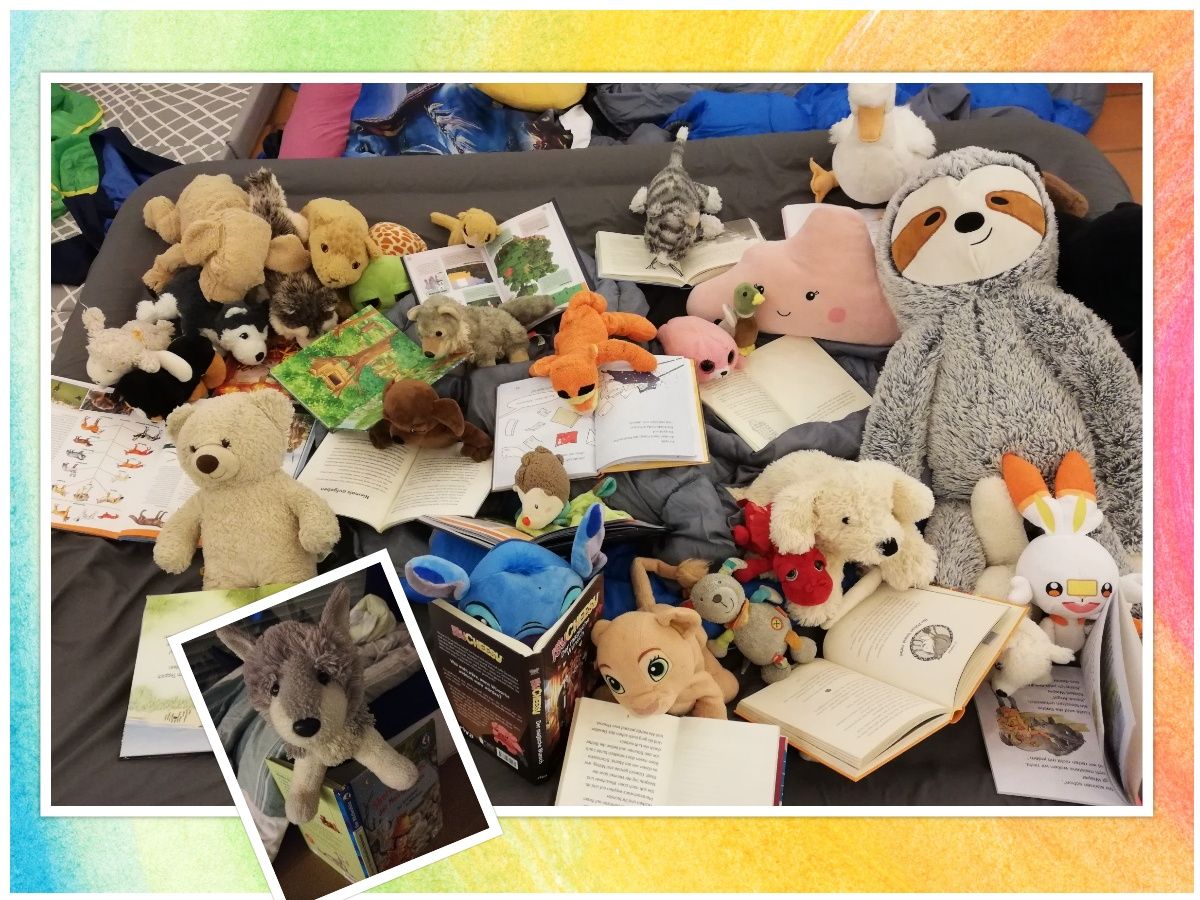 Natürlich durften neben unserem Klassentier Wölfchen auch unsere Kuscheltiere nicht fehlen. Gemeinsam hatten wir richtig viel Spaß beim Schmökern in unseren Lieblingsbüchern, beim Pizzaessen und der anschließenden Übernachtung in der Schule. Sogar der Schulgeist hat es sich nicht nehmen lassen, einmal vorbeizuschauen. Glaubt ihr nicht? Wir könnten euch da Geschichten erzählen...